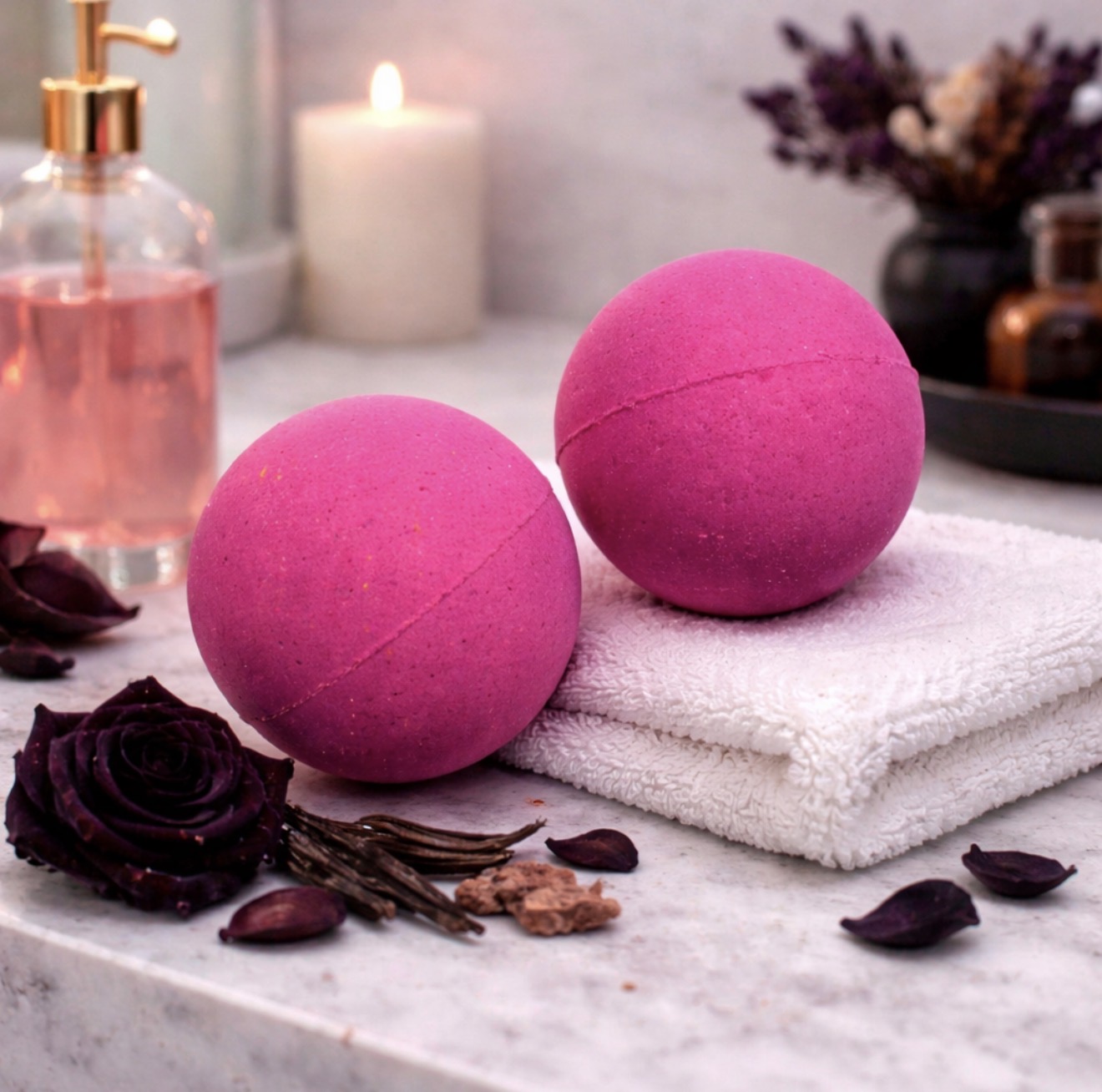 Infuse your bath with the luxurious scent of black rose and oud, courtesy of our classic ball bath bomb. Let the delicate aroma relax and rejuvenate your senses, leaving you feeling pampered and refreshed. A perfect way to add some indulgence to your bath routine