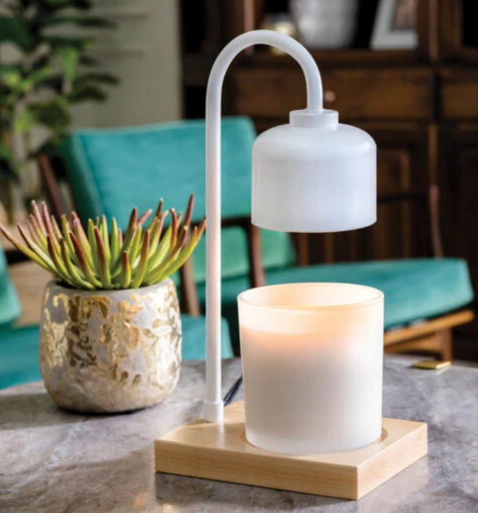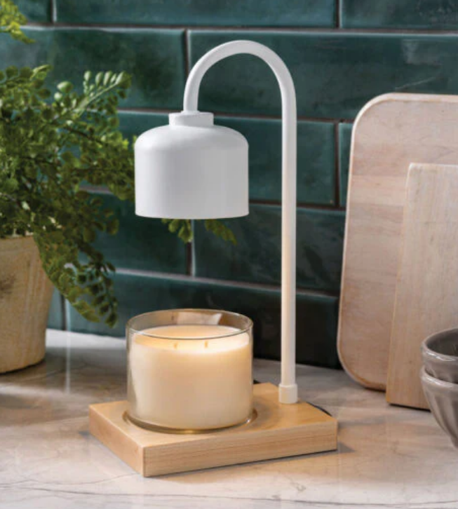 - DESIGN: Bring a touch of elegance and warmth to your home with our White and Wood Arched Candle Warmer Lamp. Featuring a modern design with a classic white stem and wooden base, the lamp safely warms scented candles without the flame, soot or smoke. Just place your favorite candle under the lamp, turn it on and enjoy the calming glow and rich fragrance!
